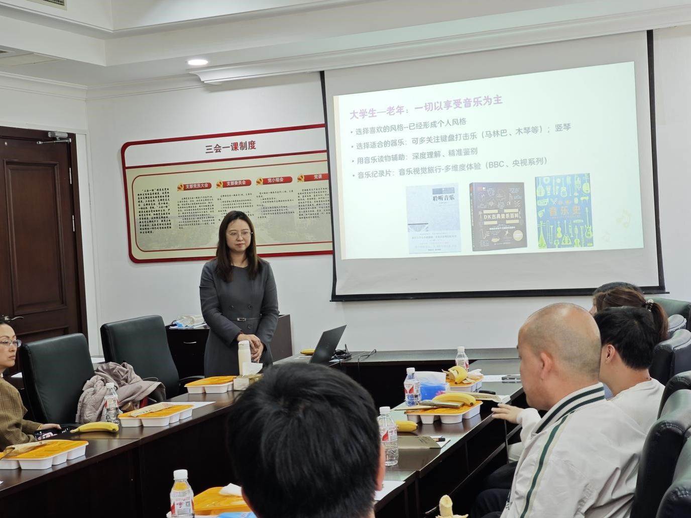 白一平就音乐学习的热点问题、青少年及成人的实践路径、我校美育教育建设等几方面分享了经验。她表示,聆听是“懂音乐”的基础和起点,要学会享受音乐,感受音乐所传递的温暖与力量,通过理解、感受、鉴别逐步提升音乐素养。与会教师认真聆听,积极互动,现场气氛热烈。此次活动提升了教师的音乐素养,激发了大家对音乐的热爱之情。与会教师均表示会将这份热情延续下去,在日常生活中用音乐滋养心灵,用艺术思维激发创新灵感。