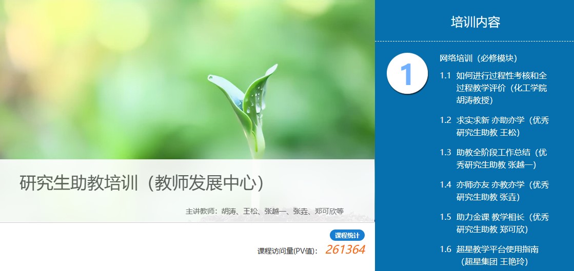 在线上学习环节,教师发展中心在“大工博雅研究生在线教学平台”上建设《研究生助教培训》在线课程,培训课程内容丰富、资料详尽,获得研究生的好评,累计页面浏览量达到261364次。针对不同学科、不同岗位助教之间的工作差异,教师发展中心采用必修模块与选修模块相结合的方式,以满足不同类型助教的学习需求,帮助助教提升角色认知和工作信心,掌握信息化教学辅助工具的实用技巧。