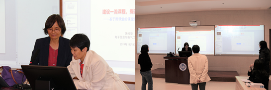 朱鸣华教授分享了计算机基础教学中心的课程信息化建设实施历程,介绍了基于慕课的课程建设经验及慕课融入课堂的不同模式,带领在座教师切身体验了智慧教学工具雨课堂的操作方法和慕课插入等功能。朱鸣华教授认为,面对当今高等教育的新形势,我校广大教师应超前识变,积极应对,了解智能时代教育的特征,做好信息化建设技术的储备,探索基于慕课的混合式教学模式的应用。一线教师应积极参与一流课程的建设,通过“评价-反馈-改进”建立持续的改进机制。