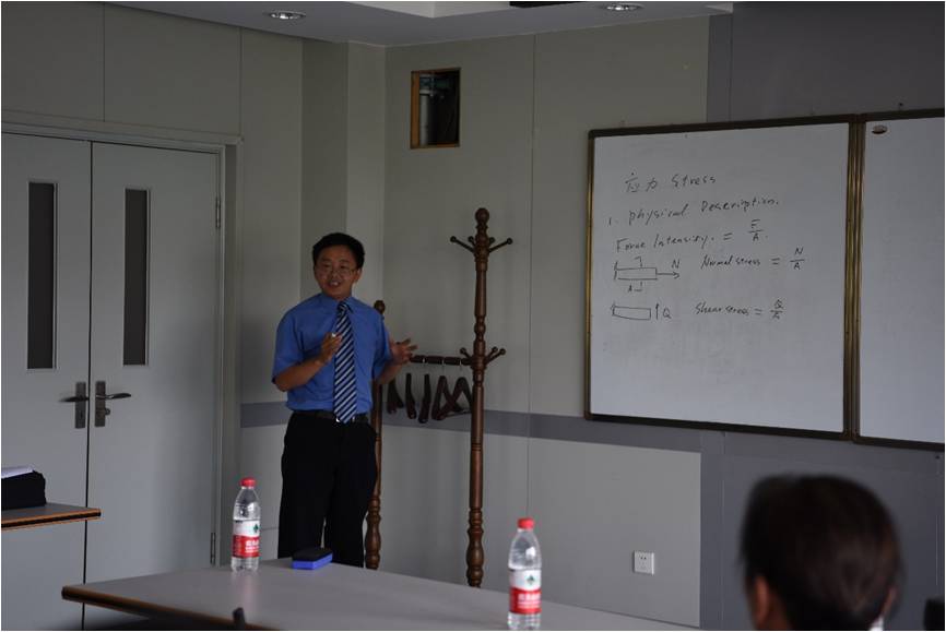 尹辉明教授进行了材料力学示范课的讲授。尹教授以应力的概念为教授内容,通过采用板书的形式,详细推导了应力和相关物理量的公式,并进行了深入浅出的讲解。