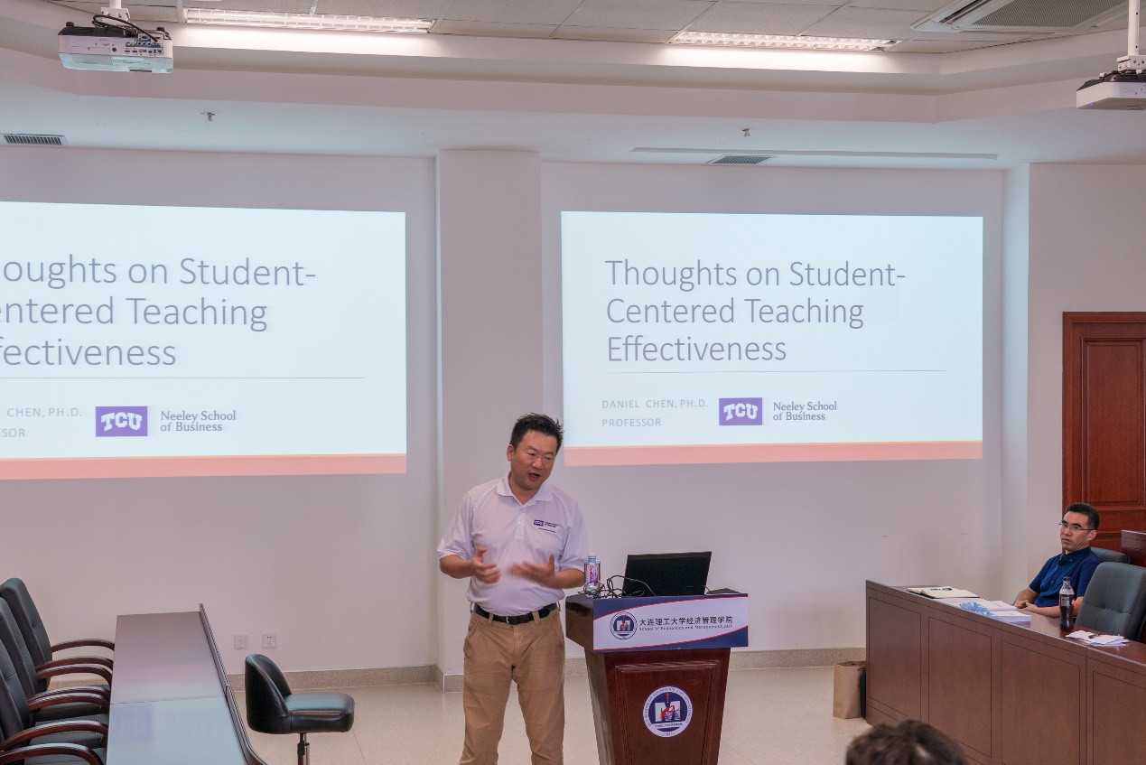 6月27日下午,在大连理工大学70周年校庆之际,经济管理学院、教师教学发展中心邀请美国德克萨斯基督教大学M.J. Neeley商学院陈其教授来校作题为《关于以学生为中心的教学方法的一些思考》专题报告。报告会由经济管理学院教务办主任宿长海主持,教师教学发展中心副主任任立春、经济管理学院党委书记叶鑫教授出席活动,来自经济管理学院和其他学部学院的青年教师参加了报告会。