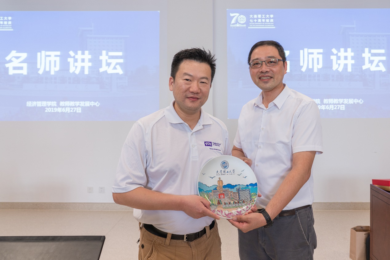 经济管理学院党委书记叶鑫教授向陈其教授赠送了学校精致的纪念品,同时代表学院表达谢意。