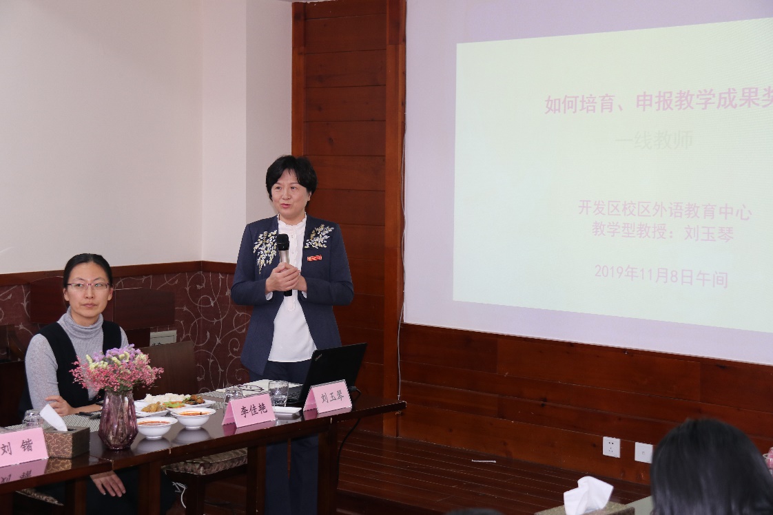 “申报教学成果奖从准备教改立项开始,着眼于解决实际问题,以教改的产出为导向,从立项之日就要开始设计申报成果,围绕一条主线‘广积粮、深挖洞’……”11月8日,午间沙龙活动主讲嘉宾,软件外语研究所所长刘玉琴教授,在布置一新的“在水一方”二楼会场,为二十余名教师就“如何培育、申报教学成果奖”分享了自己的经验。