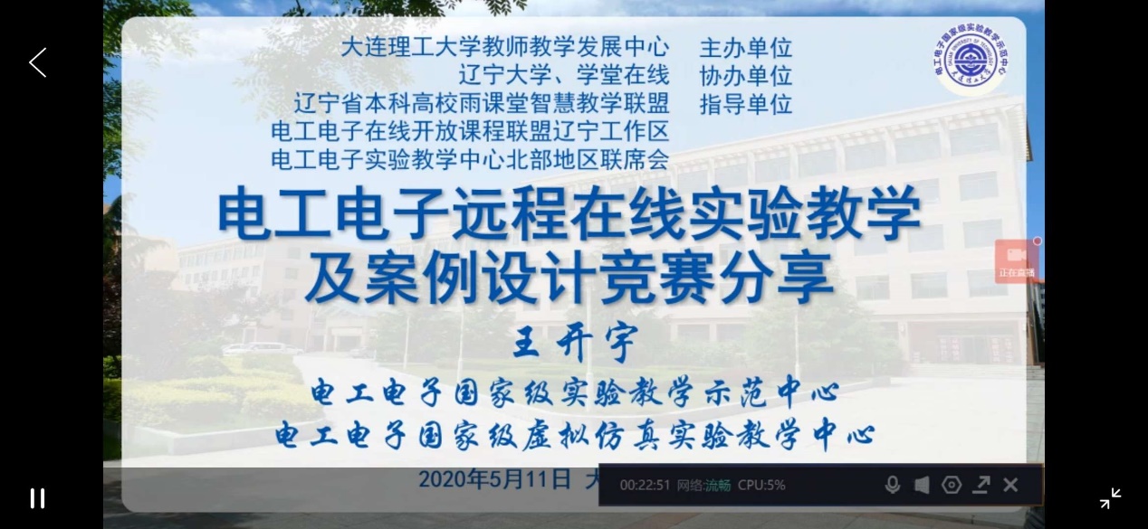 第二场讲座于5月11日举行,主题为:“电工电子远程在线实验教学及案例设计竞赛分享”。我校电工电子国家级实验教学示范中心主任王开宇教授从“在线实验课堂建设”、“实验课辅助资源建设”、“电子实验报告建设”、“加强实验过程管理”和“社会共享服务”等五个方面分享了远程在线实验教学经验。他结合信息技术广泛应用的大背景,介绍了疫情控制期间线上教学的最新进展、中国AI技术在识别新冠病毒CT方面的应用和中国在芯片领域的新成果。我校电工电子国家级实验教学示范中心依托学科优势,发挥技术特长,在实验课程建设、实验教学改革,尤其是利用虚拟仿真技术开展虚实结合实验教学改革等方面做了大量工作,取得了显著成效。