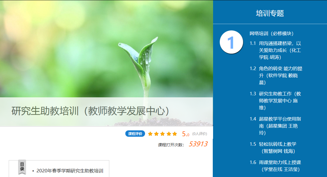 教师教学发展中心在大工慕课平台上建设“研究生助教培训”课程,研究生可以通过电脑端、手机端(学习通App)进行在线学习,提交结业报告,保证研究生在疫情期间能够顺利完成助教培训。培训课程内容丰富、资料详尽,得到研究生的好评,访问数达到53913人次。