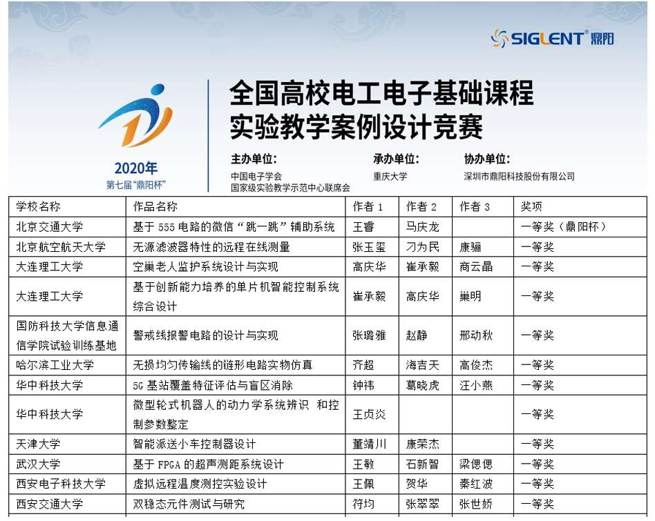 2020年6月6日-6月7日,第七届电工电子基础课程实验教学案例设计竞赛(鼎阳杯)全国总决赛在重庆大学举办,电信学部高庆华老师和崔承毅老师双双获得全国总决赛一等奖。本次比赛我校共10支教师队伍参赛,共获全国一等奖2项,北部赛区一等奖2项、二等奖6项、三等奖2项。受疫情影响,本次比赛以线上形式举行。